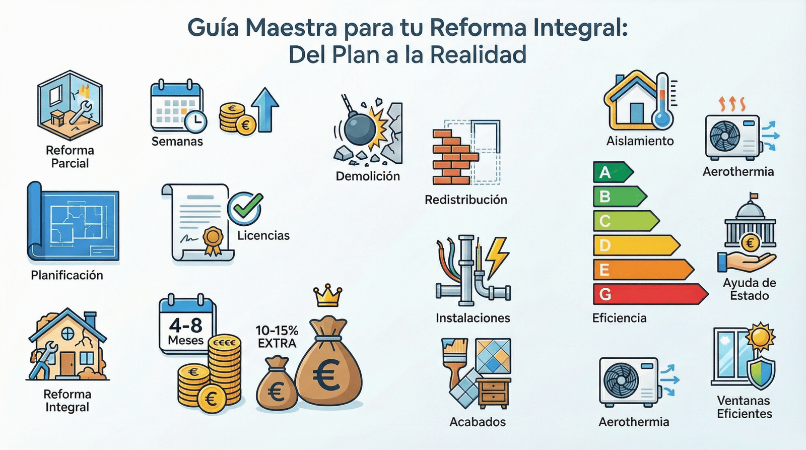 Según la guía definitiva de tipologías de obra, la diferencia fundamental es el alcance estructural. Mientras que la reforma integral es una metamorfosis total que afecta a instalaciones generales y distribución, la parcial permite: