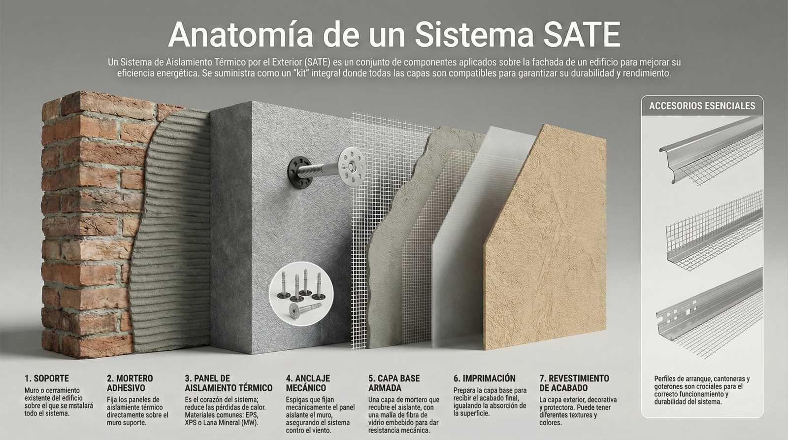 A diferencia de aislar por dentro, el SATE se fija mecánicamente a la cara externa del muro. Funciona como un kit integral: no es solo pegar planchas, es un sistema multicapa que protege la estructura, elimina los puentes térmicos (fugas de calor por pilares y forjados) y renueva totalmente la estética del inmueble.